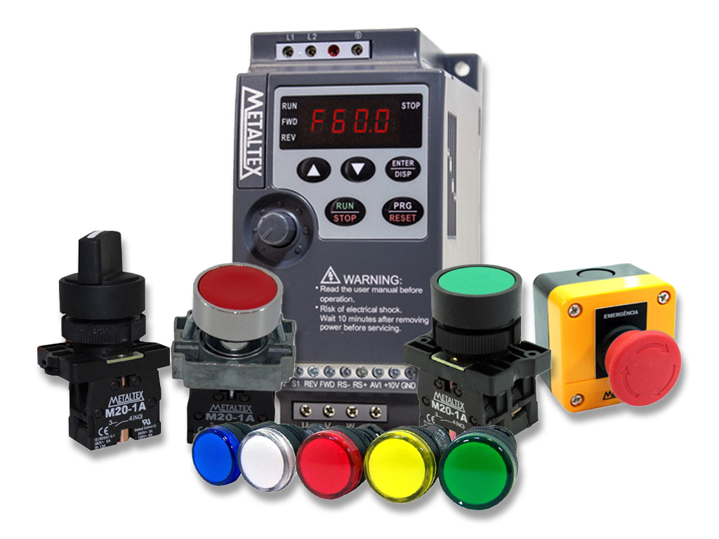 Qualidade e confiabilidade em componentes para automação industrial com a Metaltex. Apresentamos a completa Linha de Inversores de Frequência (IF10) Metaltex, projetada para otimizar o controle de motores em diversas aplicações. Além disso, oferecemos uma vasta seleção de Botões de pulso, Comutadores, Botoeiras e Sinaleiros LED Metaltex, garantindo a segurança e a eficiência da sua operação. Encontre os componentes Metaltex ideais para as suas necessidades.